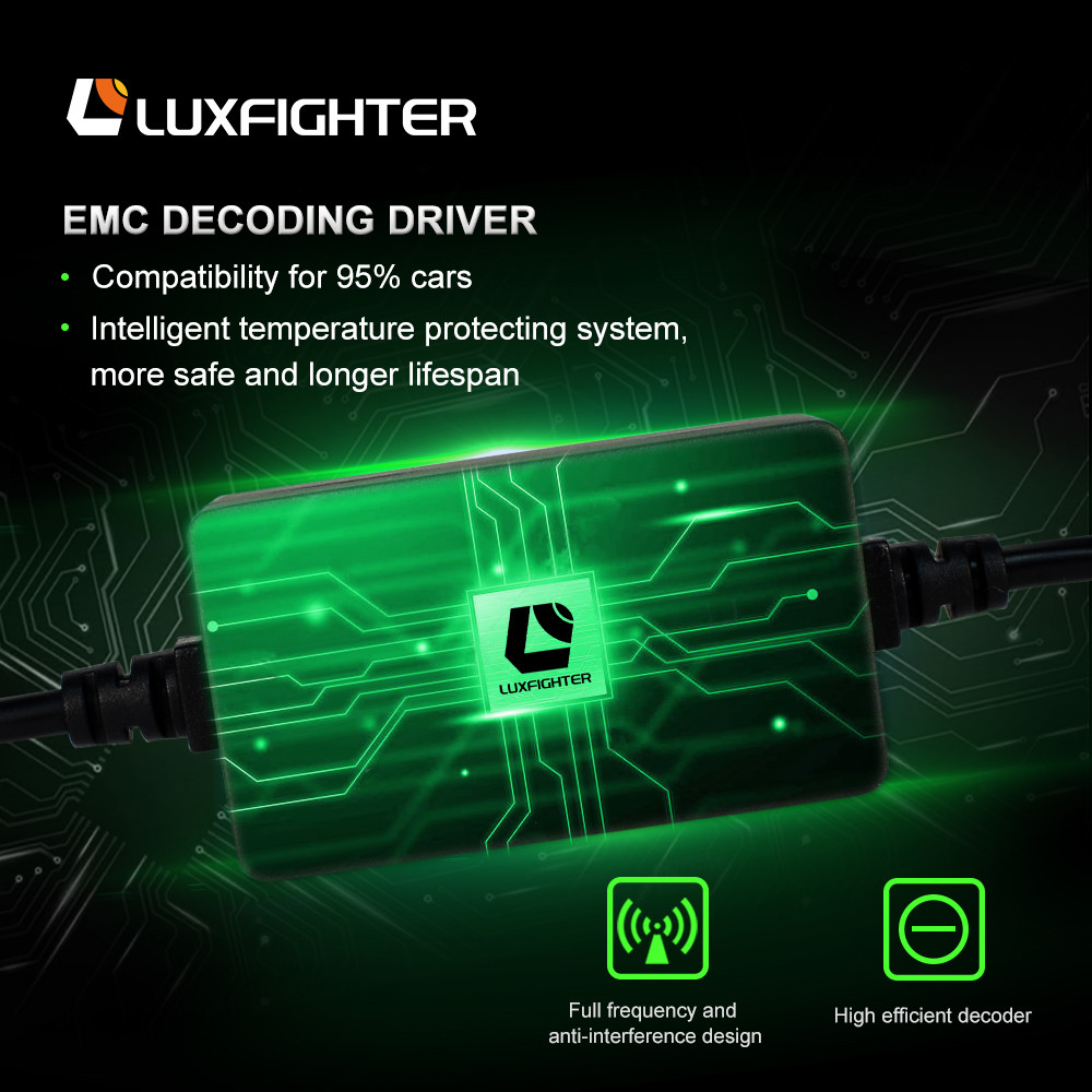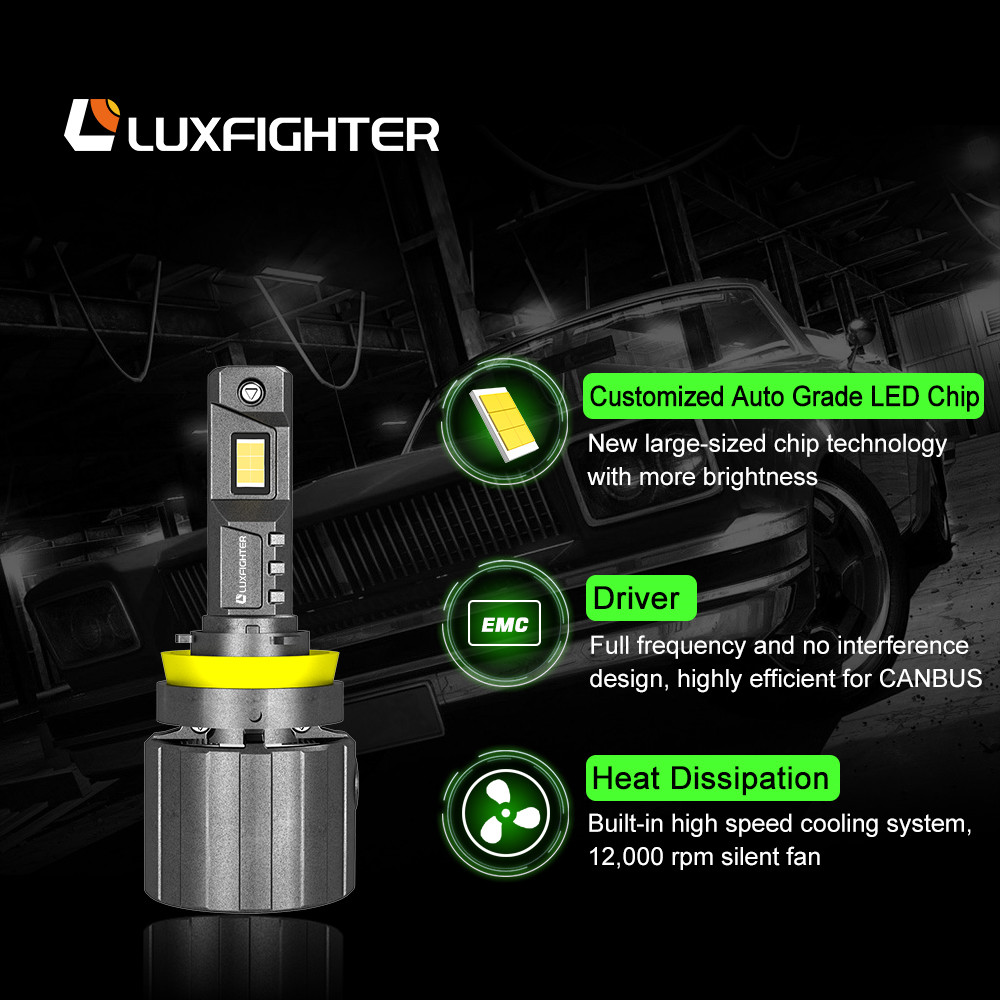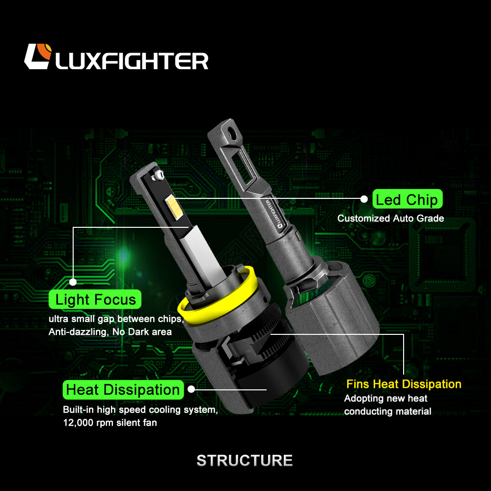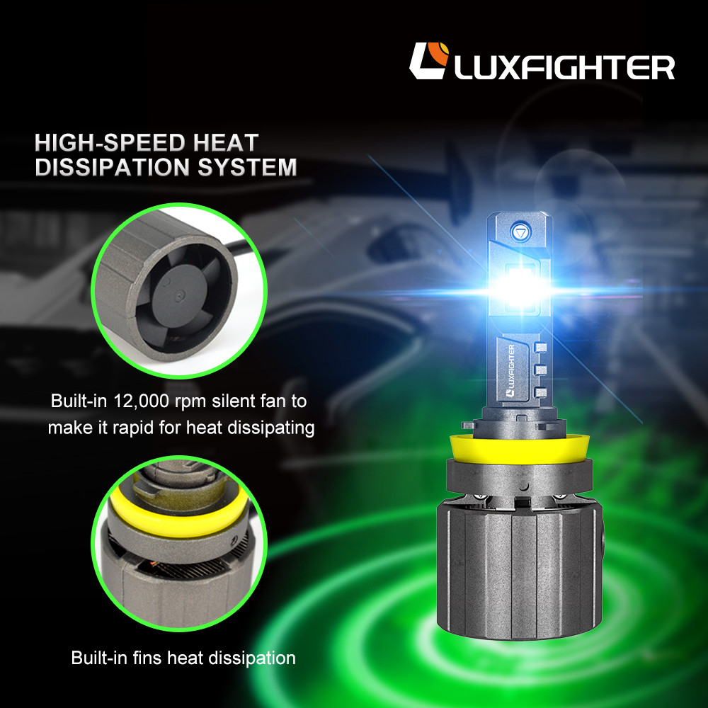 3. Triple Heat Dissipation Design: 12,000 RPM cooling fan and 90 degree turning thermal fluid, these heat dissipation designs make the lifespan of Luxfighter H7 LED lamp exceed 50,000hrs.